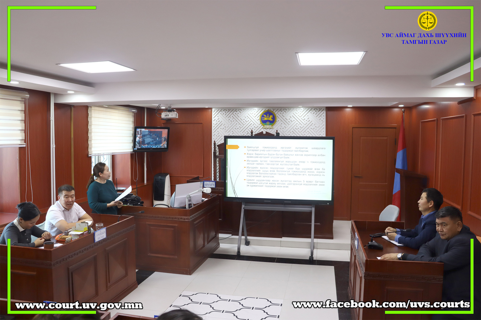 Увс аймаг дахь шүүхийн тамгын газрын Ёс зүйн дэд хорооны 2025 оны төлөвлөгөөнд тусгагдсаны дагуу тус шүүхийн тамгын газрын Ёс зүйн дэд хорооноос албан хаагчдаа ёс зүйн зөрчлөөс урьдчилан сэргийлэх, соён гэгээрүүлэх ажлын хүрээнд шүүхийн тамгын газрын албан хаагчдад “Шүүхийн захиргааны ажилтны ажлын байранд дагаж мөрдөх харилцаа, хандлагын нийтлэг журам”-аар сургалт зохион байгууллаа.