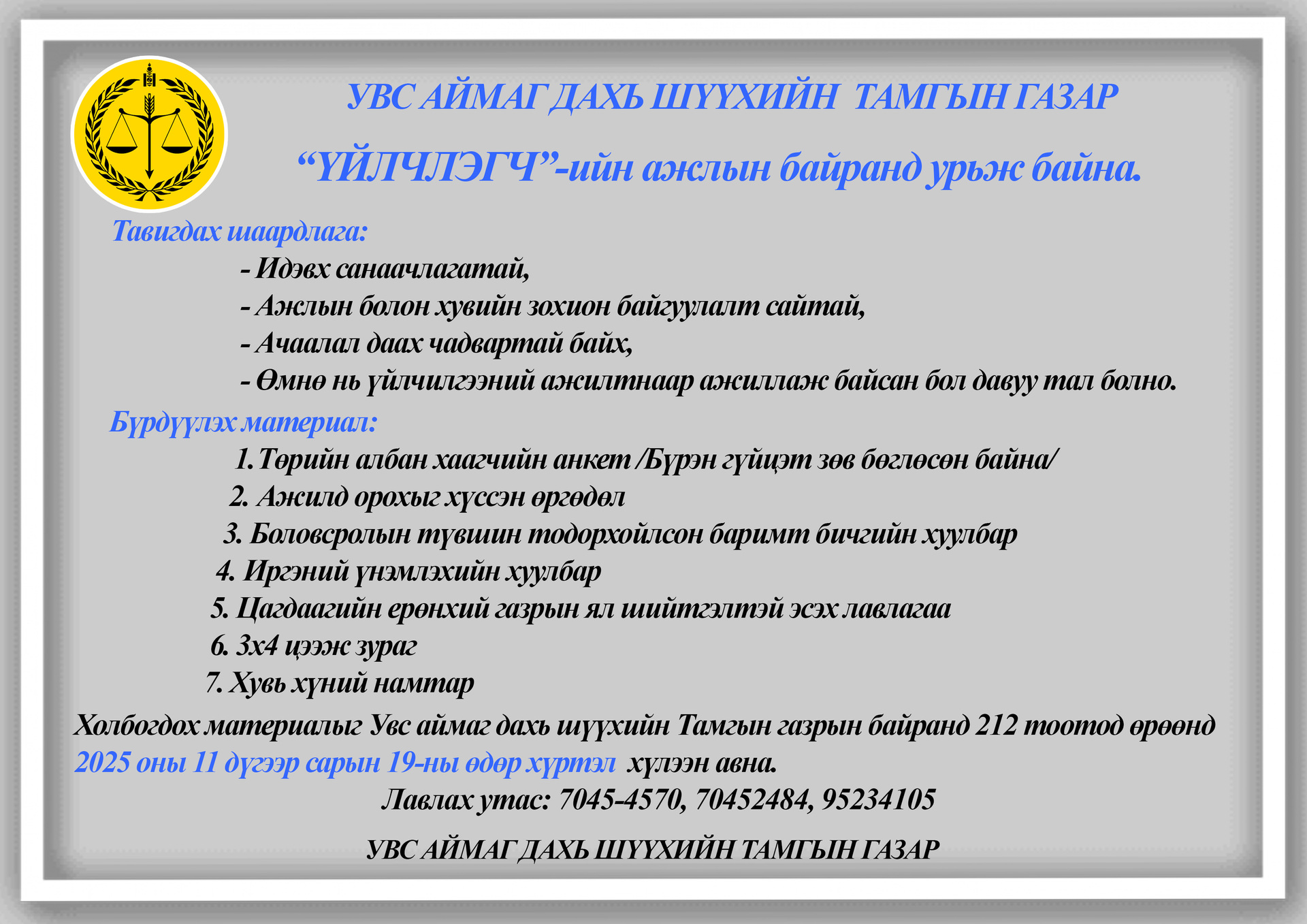 УВС АЙМАГ ДАХЬ ШҮҮХИЙН ТАМГЫН ГАЗАРТ “ҮЙЛЧЛЭГЧ”-ИЙН АЖЛЫН БАЙРАНД УРЬЖ БАЙНА