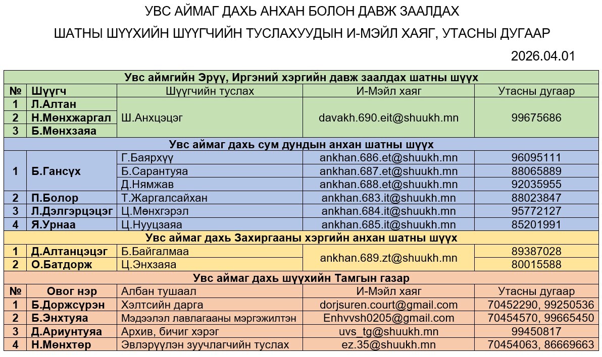 ШҮҮГЧИЙН ТУСЛАХ, ШҮҮХИЙН ТАМГЫН ГАЗРЫН ЗАХИРГААНЫ АЖИЛТНУУДЫН И-МЭЙЛ ХАЯГ, УТАСНЫ ДУГААР